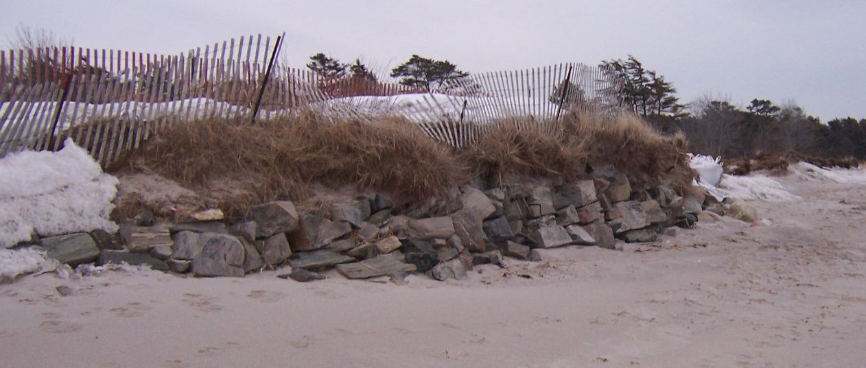 Well, perhaps. But my rough pacing off of the area that’s now obviously under construction was at least 200 feet. And that doesn’t include the 500 or so feet of huge sand bags farther down the beach (see image above). That sure looks like a part of the dune line that would be a candidate for “hardening.” I’ll report back next time with the real scope of the seawall project after I review the Department of Environmental Protection permit documentation. In the meantime, let’s leave Mr. Donovan’s 50-100 foot guess in the “subject to fact-checking category.”