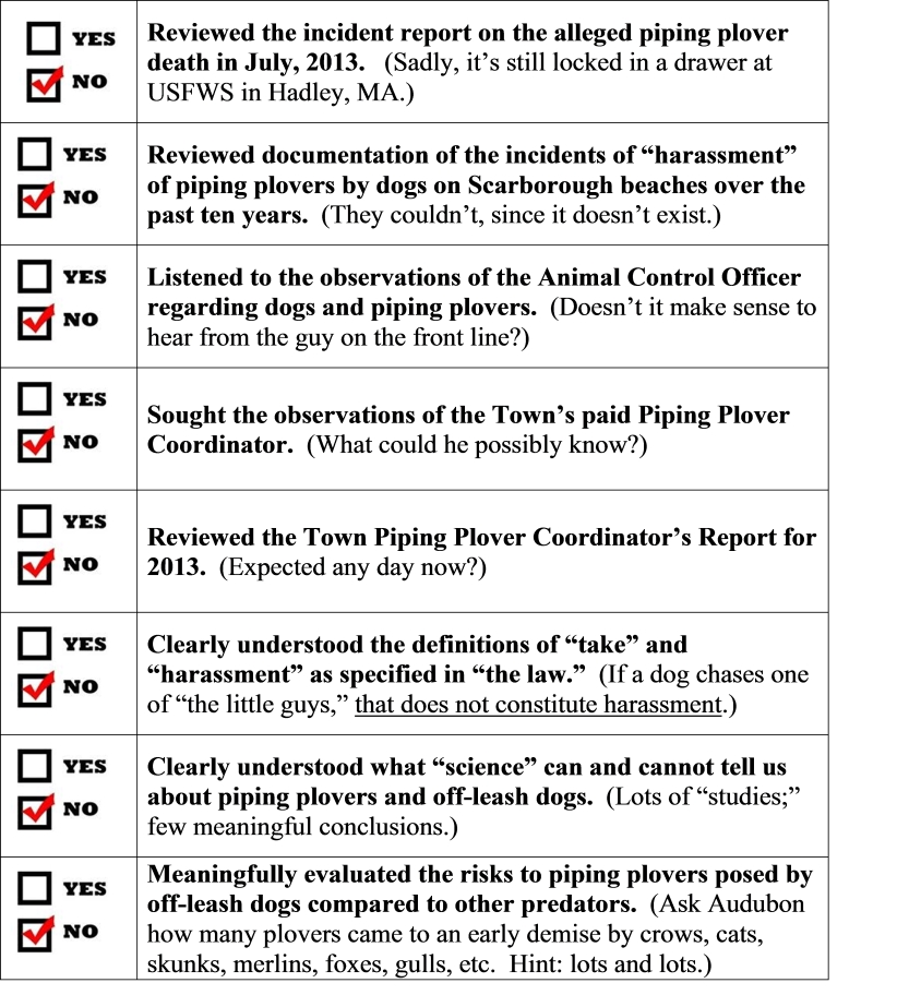But the most painful part of the process is yet to come… it will take place at the workshop.  The thought of sitting there in the audience – in enforced silence – while Councilor Donovan waxes lyrical about how hard the group worked, and how they really got into the issues, and how they reviewed dozens of “scientific studies” (that concluded that the only way to protect piping plovers is to have dogs on 8-foot leashes), and how there were honest differences of opinion, and how everybody gave a little, and how this proposal was the least restrictive on dog owners that would still protect piping plovers IN COMPLIANCE WITH THE LAW, and so on, and on, and on.  Expect lots of choking noises coming from the peanut gallery as the charade comes to a glorious and fully-expected end.  Pax vobiscum.