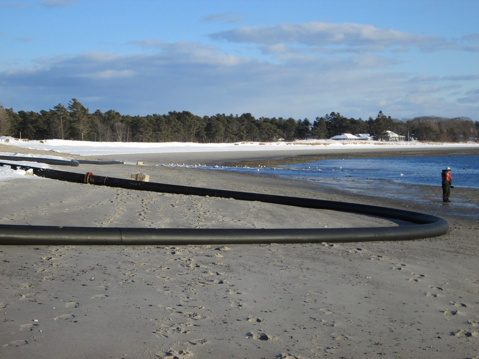 Looks like last week’s storm set things back a bit.  After a couple of days of pumping sand out of the channel and on to Western Beach, the storm came along and appears to have breached the pipeline.  That’s apparently corrected now, but the wind is making for less than ideal dredging conditions.  Hopefully the pumping can resume again soon.